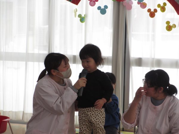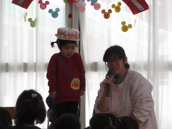 1月23日(金)1月生まれの誕生会がありました。今回の誕生会は、12月のお誕生会にお休みしてた子も合わせて12人と大勢のお友だちがお祝いしてもらいました!自分のインタビューのときにケーキの帽子をかぶせてもらうのをドキドキしながら待ちました。みんなケーキの帽子が良く似合っていましたよ😊