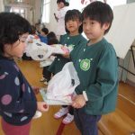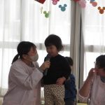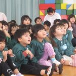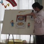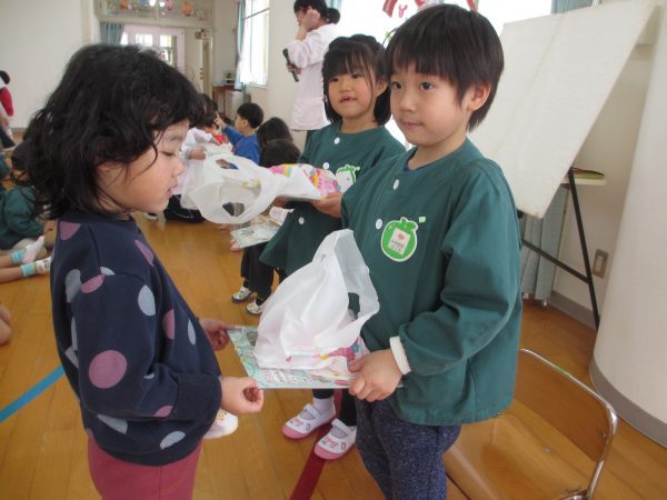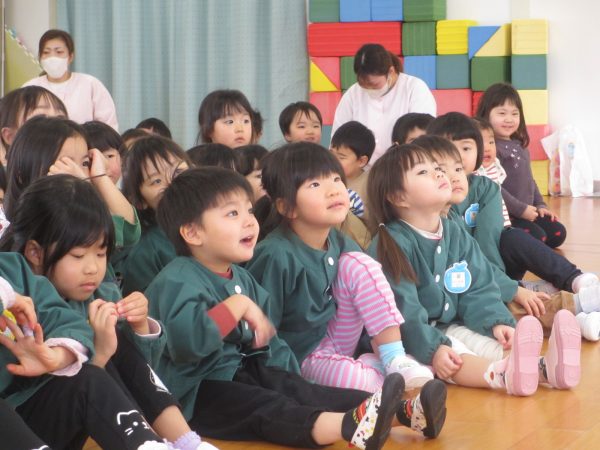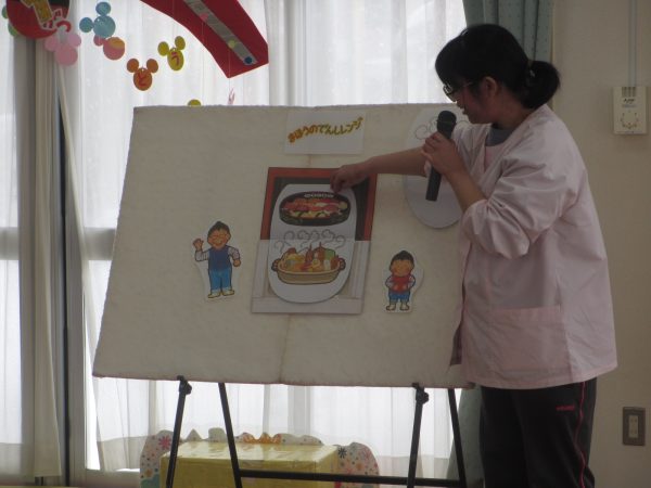 先生のお楽しみタイムは、パネルシアター「魔法の電子レンジ」でした。空っぽのお皿を電子レンジの中に入れて、おまじないをとなえると食べたい物ができあがります。できあがる時の「チーン🎶」という音がどんな物ができるのかな~とワクワクさせてくれるようなシアターでした。