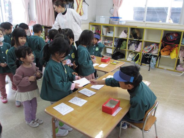 1/6から始まった郵便ごっこは、ひまわり組が交代で郵便屋さんになり、ハガキの販売と配達をしてくれました。お友だちや先生たちに沢山ハガキを書いていた子どもたち。毎日自分のポストを見て、「私〇枚届いた!」「今日は〇〇ちゃんに書こうかな」等と楽しそうな会話が沢山聞こえてきました!