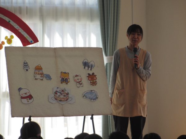 先生のお楽しみコーナーはパネルシアター「ペンギンくんのカチコチお誕生日」でした。ペンギン君のプレゼントを雪の積もった外に忘れて来てしまい、探しに行くとプレゼントがカチコチになっていました。さー大変‼そこで、凍ったプレゼントを保育園のお友だち全員の力で溶かすことにしました。ほっぺに手をあてて「ほっかほか」、手を両手でこすって「すりすり」、自分を抱きしめて[ギュー」として次々にプレゼントを温めて溶かしてくれました。子どもたちの温めるしぐさがとっても可愛かったです😊心の温まるお話でした。