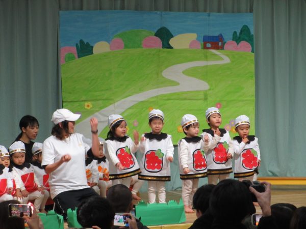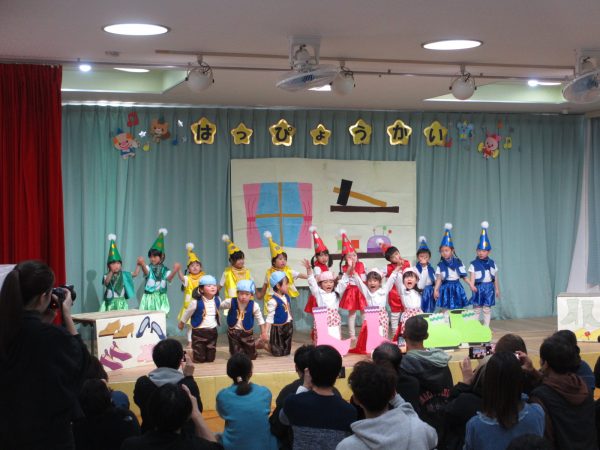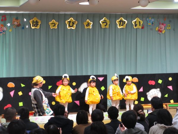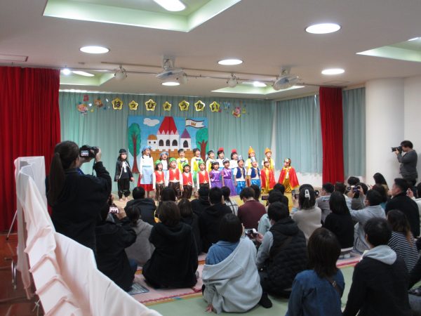 遊戯、劇、歌、リトミック。今日まで沢山の練習をしてきました。幕が開く前は緊張している姿も見られましたが、幕が開くと目をキラキラ✨輝かせながら堂々と演じてくれました。練習の成果を十分に発揮でき、本番が1番上手にできました😊発表会の翌日、登園してきた子どもたちが、「発表会楽しかったね😊」「またやりたいね」と言う声が聞かれ、子どもたち自身も満足のいく発表会だったのかな?と思いました。