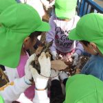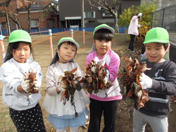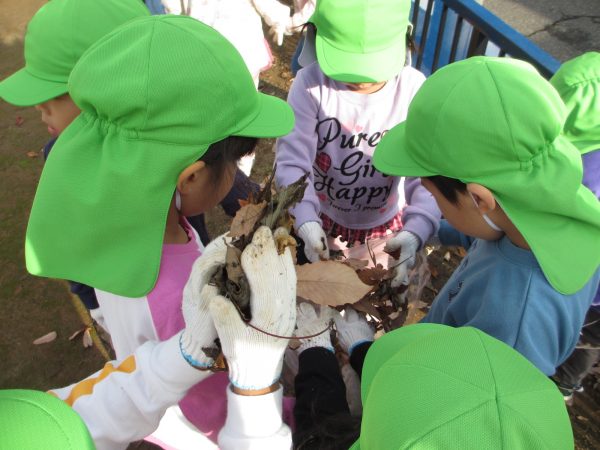 手で上手に集めながら腕いっぱいに落ち葉を拾い落とさないように気を付けて袋に集めていきました。「ここにもたくさんあるよ」「柵の脇に落ちてるから拾おう」「一回でこんなに拾えたよ」など自分たちで落ち葉を探しながら大きなビニール袋4枚分にたくさん拾ってくれました✨