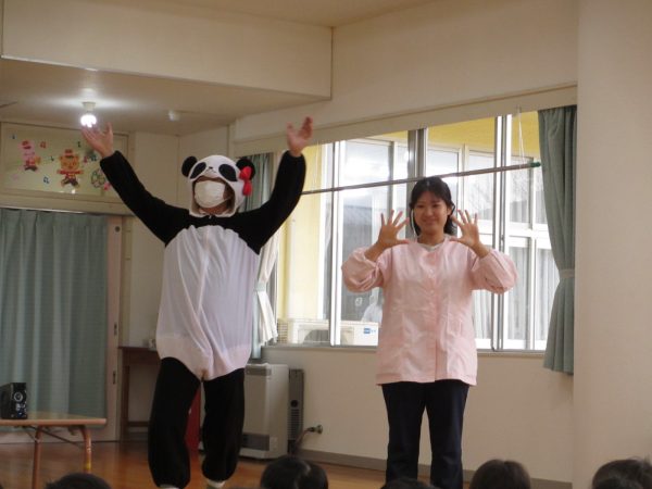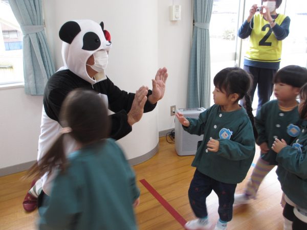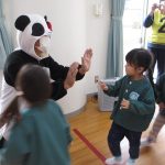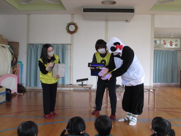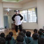 紙芝居を見たり、途中から可愛いパンダさんも登場!さらに楽しくお話が聞けました。手が上手に洗えてるかを見るためにブラックライトを使いました。パンダさんと先生の掌を見ると…バイキンがいっぱい💦みんなできれいに手を洗いもう一度検査すると、ぴかぴか✨になっていました💖
