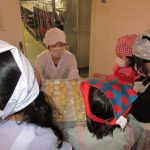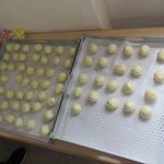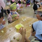 調理員が丸めてくれた肉まんの皮を、1個づつ丸くのばして具(シュウマイ)をつつみました。子どもたちは「肉まんの皮は、のばしても直ぐに縮んできてしまうことがあるから、延ばすのは少し難しいかもしれないよ‼」と聞いていたので、時々「あっ!!皮が戻ってくる(縮んでくる)」と言いながらも一生懸命生地をのばしていました。以前笹団子を作りで生地の中にあんこを包む経験をしたことがあったので、シュウマイを包むのはとっても上手で、次々に肉まんが完成していき皆で129個作りました。楽しい肉まん作りでした。