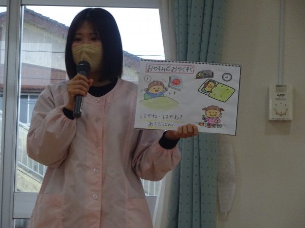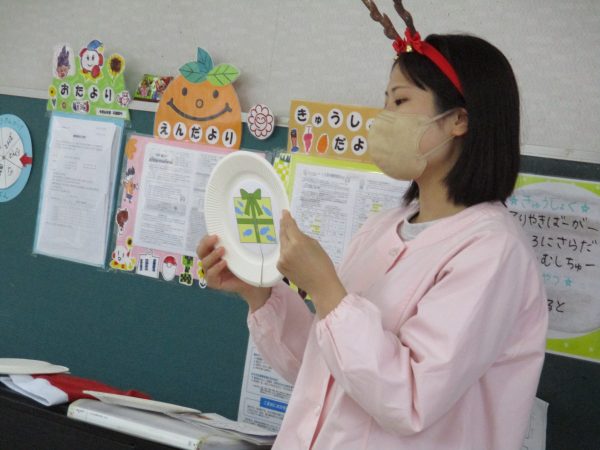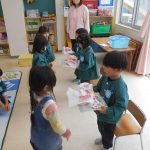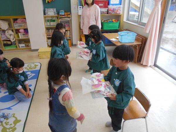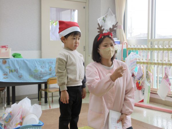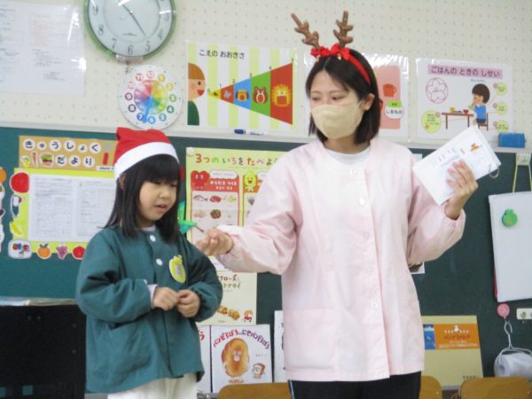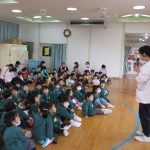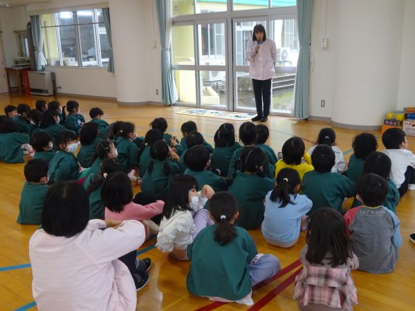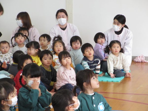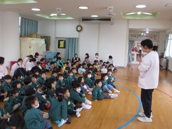 26日(金)の集会では、さくら、ばら、ひまわり組が年末・年始のお話を聞き、長いお休み中のお約束もしました。①早寝、早起きをして朝ごはんをしっかり食べましょう。②自分のことは自分でやりましょう。③手洗いうがいをして元気に過ごしましょう。の3つのお約束をしました。楽しいお休みが過ごせると良いですね。