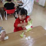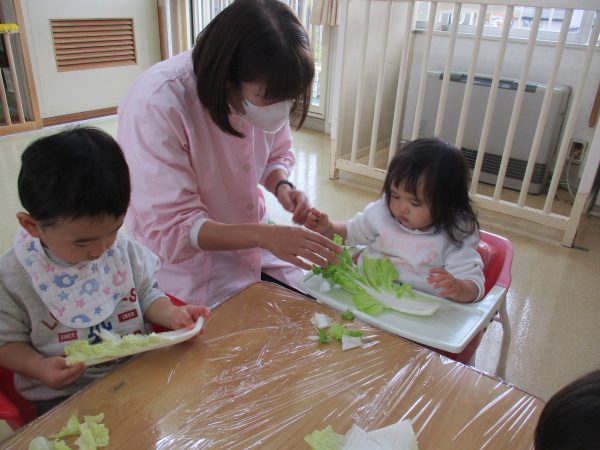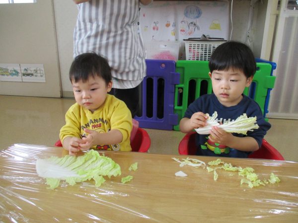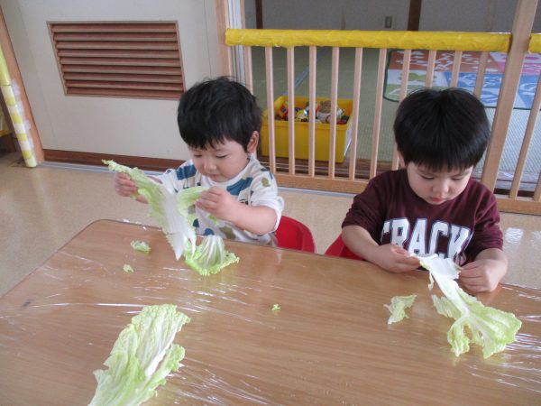 白菜という野菜だよ、ビリビリしたりちぎったり出来るかな?