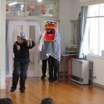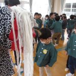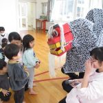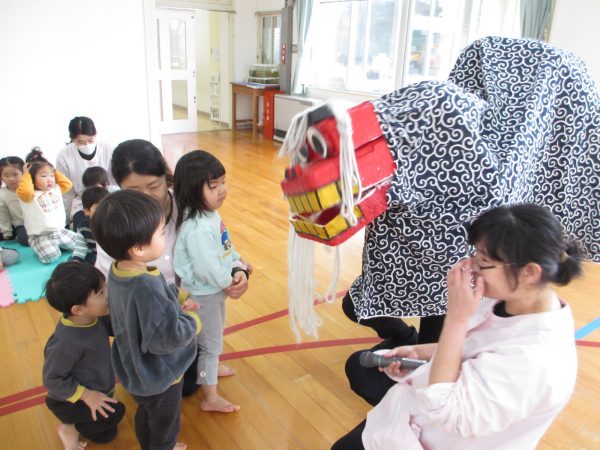 新年と言う事もあり、獅子舞も登場!びっくりして泣いてしまう子もいましたが頭をカプッと噛んでもらいました。