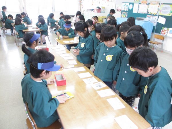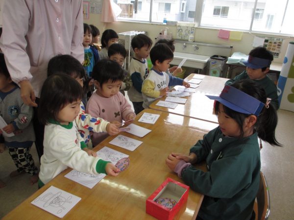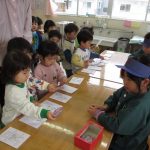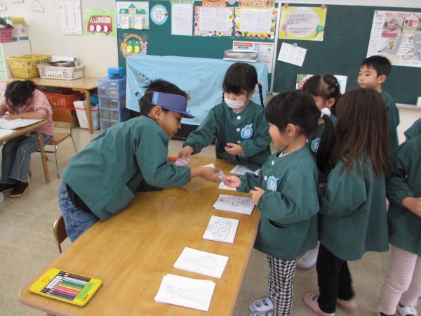 ひまわり組が順番に郵便屋さんになり、はがきを売ったり配達してくれます。保育園のお友だちは、100円玉(紙)を持ち自分の好きなはがきを選んで買いお友だちや先生に出します。子どもたちは、「○○ちゃんに書くね」「沢山はがきが届くといいな‼」とワクワクしています✨