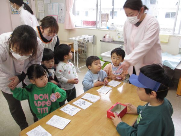 先生からのお楽しみタイムは、紙皿シアター「このプレゼントは誰のプレゼント?」でした。プレゼントの箱の模様をヒントに誰のプレゼントか当てるクイズでした。2枚に重なっいている紙皿を少しずつ動かしていくと答えが見えてきます。人参の模様は「うさぎ」と直ぐに分りましたが、魚の模様は中々わからず、「ペンギン?」「仲間の魚?」等色々答えましたが、最後に「ねこ」と正解できました。とても盛り上がって楽しかったです😊