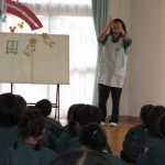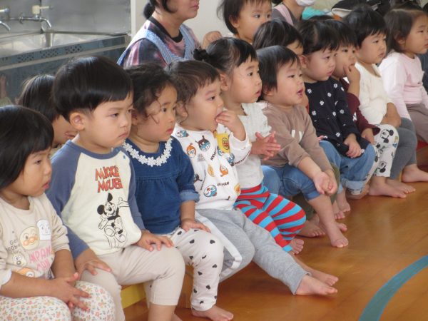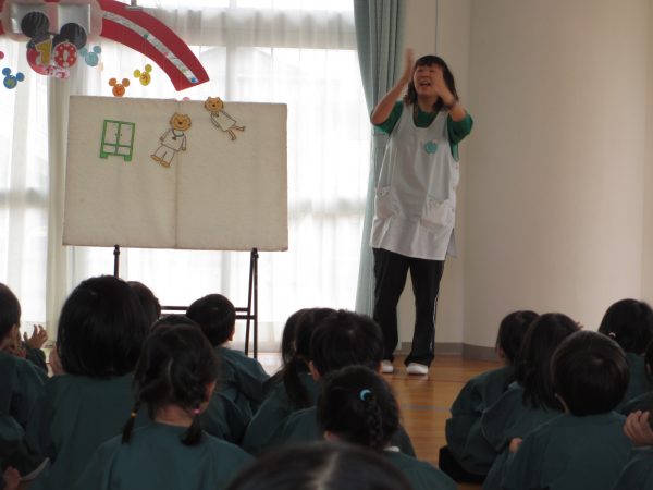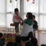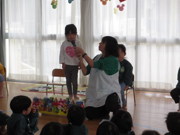 先生からのお楽しみタイムは、ミュージックパネルシアター「ねこのお医者さん」でした。子どもたちも参加型のシアターだったので、音楽に合わせて歌ったり手をたたいたりして一緒に楽しむことができました。笑い声の多い楽しい誕生会でした♬