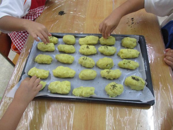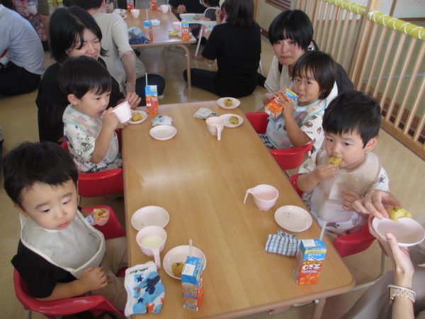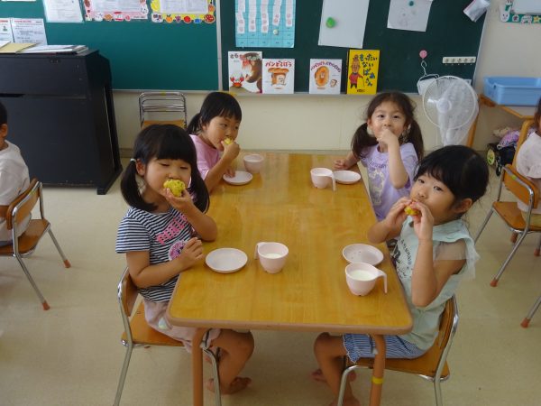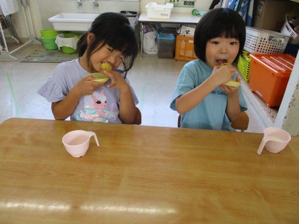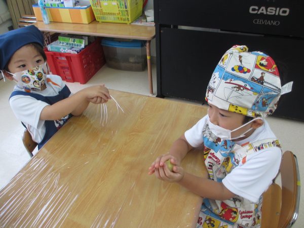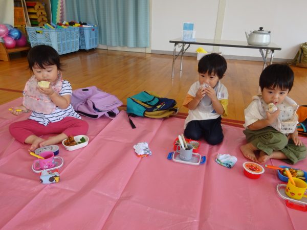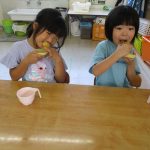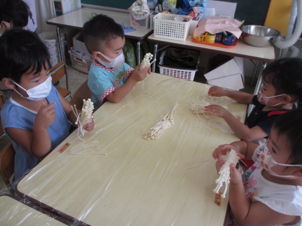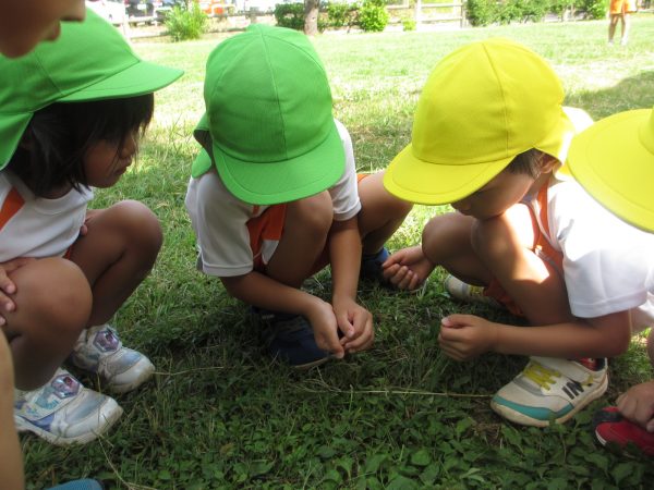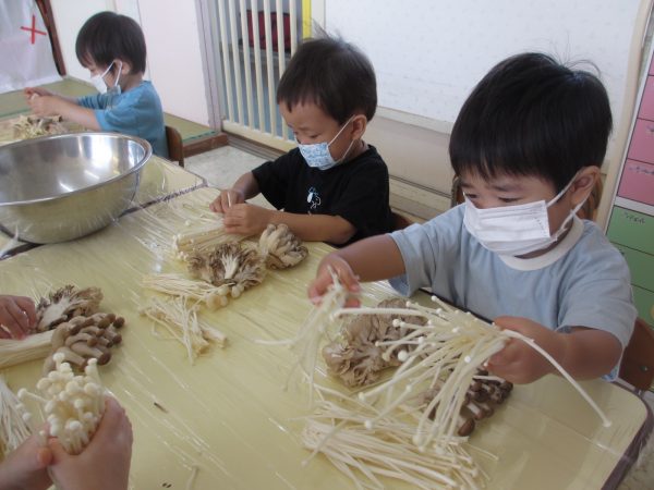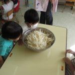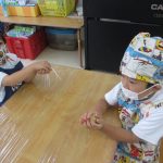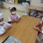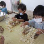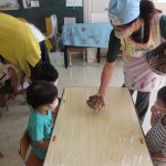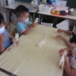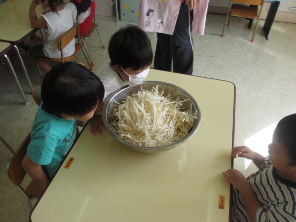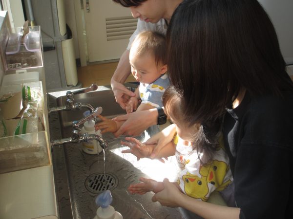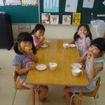 幼児組では、「〇〇ちゃん、お水がでてるよ‼」『この紙誰が捨てたの?まだ使えるよ‼」「もったいない婆さんが来るよ‼」と友だち同士で声を掛け合っています。手洗いの時の水の出し方やティッシュの使い方にも気をつける姿も見られます。