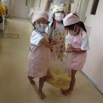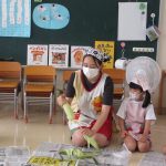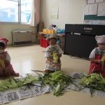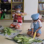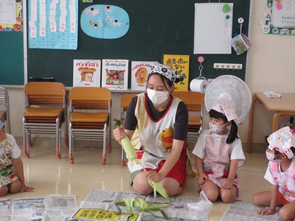 保育者が、「これは何でしよう?」と皮をむく前のとうもろこしを見せると、大きな声で「とうもろこしー」と答えました。図鑑や、スーパーで見たことがあるそうですが、皮むきをしたことは無い子が多く、今日の活動を楽しみにしていたようです。