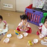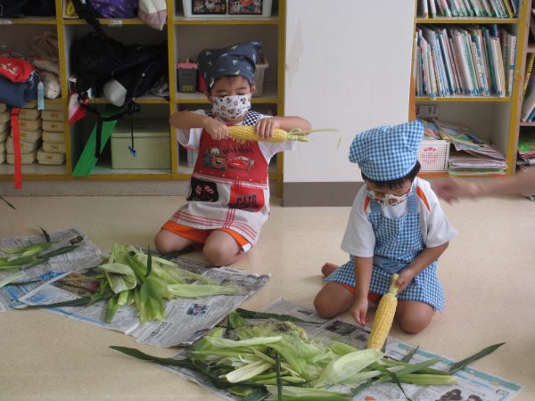 皮むきを始めると、1枚ずつ丁寧にむく子。何枚もまとめてむくので中々むけず苦戦している子。と様々でしたが、とうもろこしの実が見えてくると「先生とうもろこしが見えてきたよ。」と目を輝がやかせながら教えてくれました。