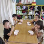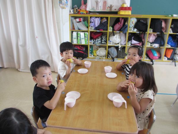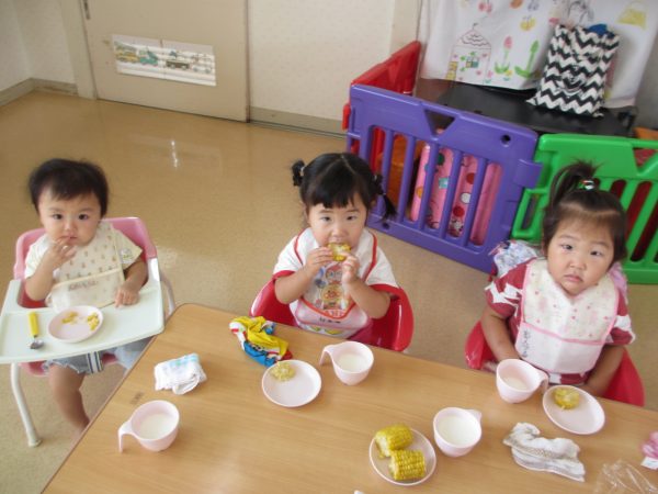 沢山むいたとうもろこしは、給食の先生から茹でてもらい3時のおやつにおいしくいただきました💖とても甘くて美味しかったです。ばら組さんありがとうございました。