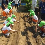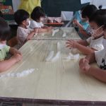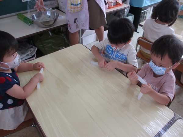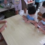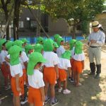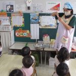 先生からのお楽しみタイムは、「たんじょうびマンがやってきた」という言葉あそびシアターでした。たんじょうびマンが持ってきてくれた沢山のプレゼントには文字が書かれていて、その文字をヒントに箱の中のプレゼントを当てます。ちょっと難しい文字のプレゼントは、更に先生からヒントをもらい皆で考え全部正解できました。楽しいシアターでした。
