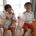 始めのうちはこんにゃくのぬるぬるが苦手で、中々手が出せなかったり、ちぎるというよりもこんにゃくの両端を持ち「ん~」と力を込めて引っ張ったりと苦戦していましたが、保育者と一緒にやってみるうちに、段々とコツをつかみ、上手に指先を使ってちぎれるようになりました。活動を終えた子どもたちからは、「楽しかった」「気もち良かった」「もう一回やりたい」という声が聞かれました☺