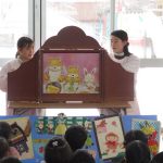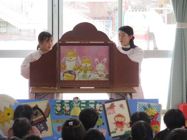 2月4日(水)2月のお話ポケットに参加しました。今月のお話は大型紙芝居「えほうまきもぐもぐ」でした。うさぎとくまが、くまのお婆ちゃんと一緒に恵方巻を作って食べるお話でした。紙芝居舞台(ケース)を使った本格的な演出だったので、子どもたちも真剣に見ていましたよ。