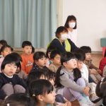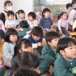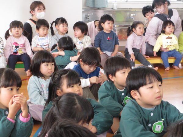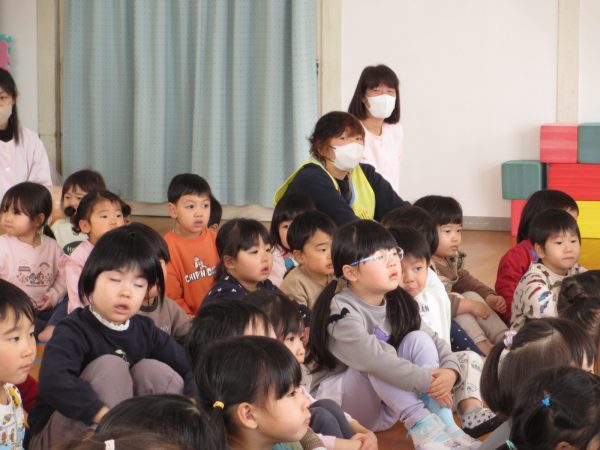 紙芝居の中で、「恵方巻は七福神にちなんで7種類の食材を入れて作るんだよ。」とくまのお婆ちゃんが教えてくれました。昨日(3日)の節分の日に恵方巻を食べたお友だちが沢山いて、とても身近に感じられたお話でした。