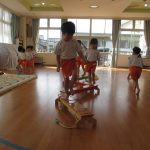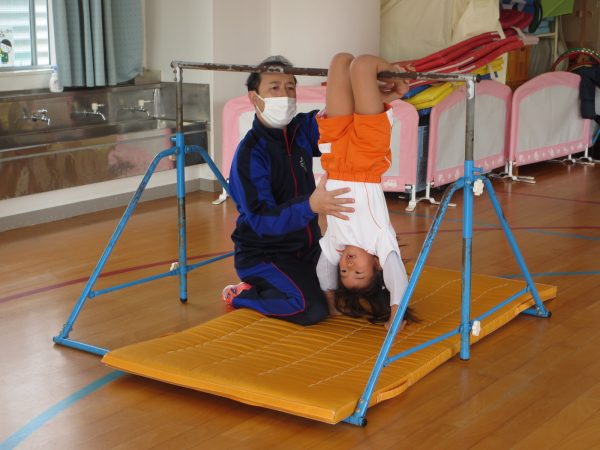 毎月1回、講師の岡田先生が来てるれるのを楽しみにしていた子どもたちは、先生の姿を見つけると「岡田先生、おはようございます。今日は何するの?」と元気いっぱいに挨拶して自分たちのクラスの時間が来るのを待っていました。準備運動から楽しく動けるような内容なので子どもたちはずっと笑顔で走り回ったり、鉄棒、マット、跳び箱にも沢山挑戦できました。