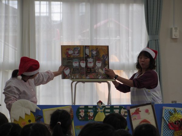 今月のお話は、『100にんのサンタクロース』というお話でした。みんなが楽しみにしているクリスマスにピッタリの絵本でした🎄サンタクロースが100にんいたら…。とみんながにこにこ見ていましたよ💖