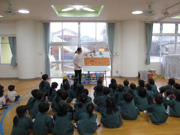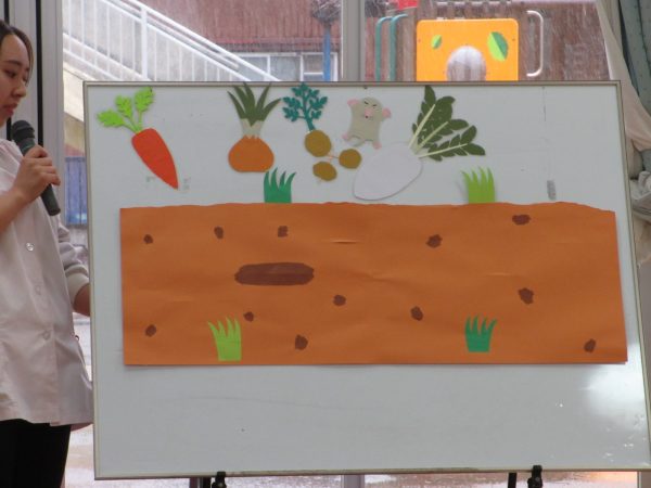 今日は、最初に「やさいさん」という絵本からの問題で、土の中から出ている野菜の葉っぱを見て何の野菜かをあてるクイズに挑戦しました。ちょっと難しいかな?と思いましたが、ヒントを聞きながら考えました。ひまわり組は大根を育てただけあって、大根の葉っぱを見ただけで「だいこん」と答えていましたよ。