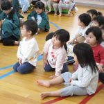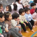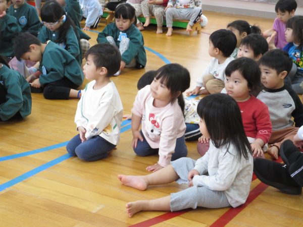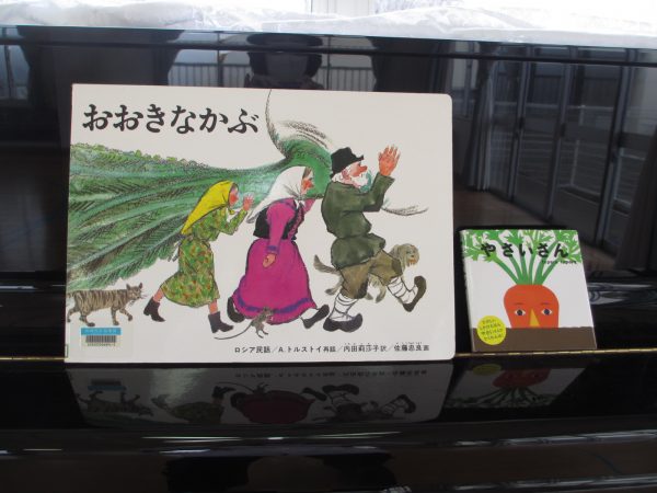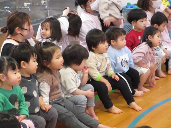次は大型絵本「おおきなかぶ」を見ました。「このお話知ってる‼」という子も多く子どもたちの好きなお話のひとつでした。お話の中に出てくるかぶを抜く場面のかけ声の「うんとこしょ‼どっこいしょ‼」の場面では、子どもたちも一緒にかけ声をかけてくれたので、遊戯室中大きな声が響きわたっていました。すみれ、つぼみ組のお友だちも、少し長いお話でもしっかり最後まで見ていられるようにまりましたよ😊楽しいクイズとお話でした。