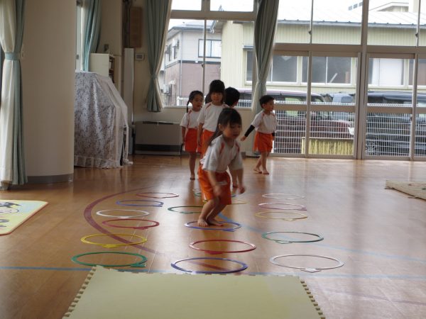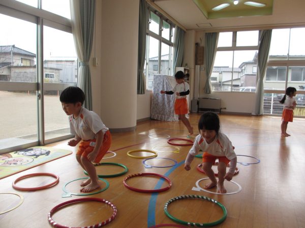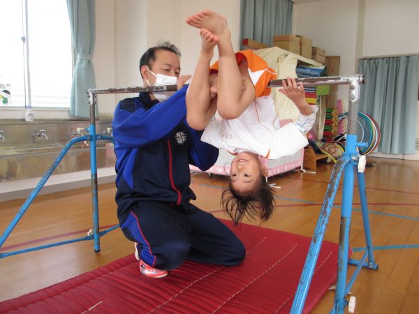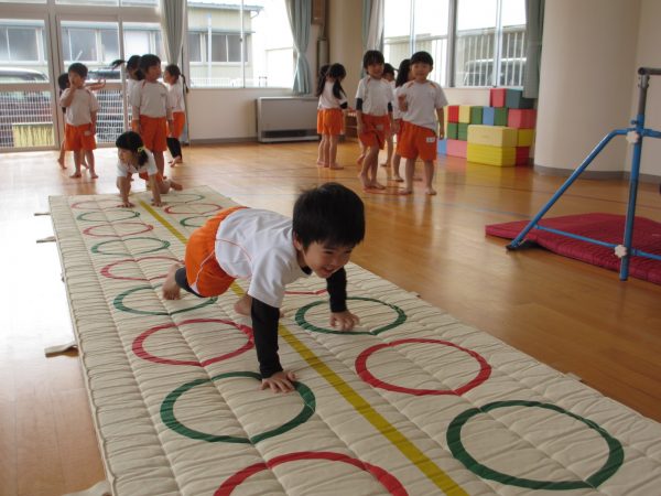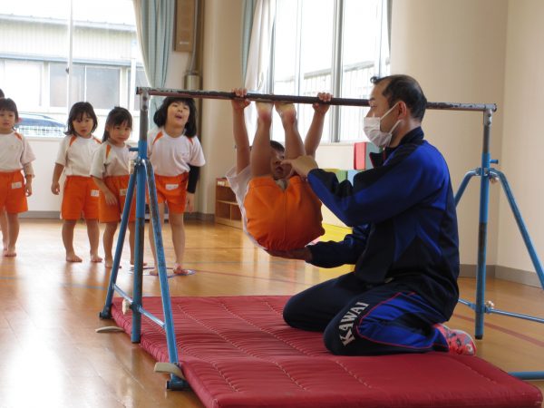 今日は、鉄棒、輪っか跳び、マット等の運動に挑戦しました。鉄棒は、ただぶらさがっていただけだっらのが、足を棒までもっていけるようになったり、回ったりもできるようになったりと、年齢ごとに少しずつでできることも増えてきています。いろいろな運動での身のこなしも上手になりましたよ‼